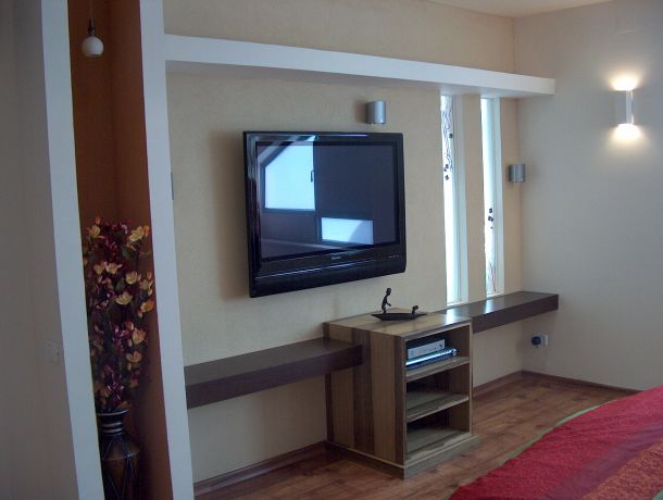 קיר בחדר שינה, מדף עץ , נישות גבס,