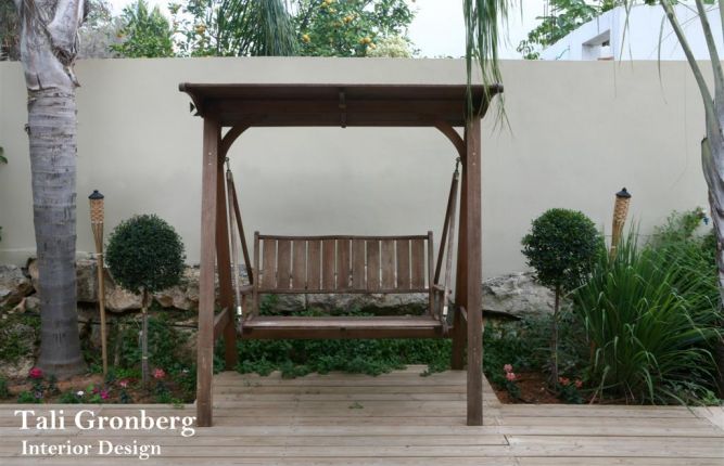 פינה בחצר , נדנדת עץ, דק, צמחיה.