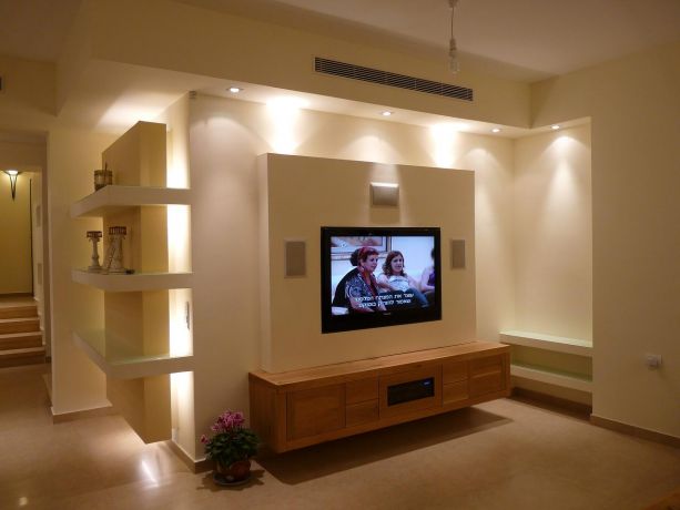קיר פלזמה בסלון עם תאורה סמויה, עיצוב סיגל נייגרציק אבירם