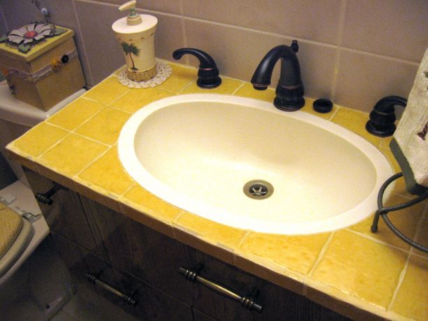 אמבטיה כפרית בשילוב קרמיקה מבריקה צהובה