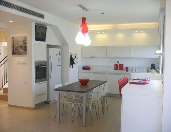 מטבח לבן עם נגיעות באדום ושולחן זוברנו