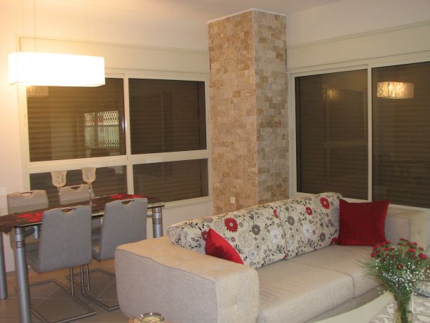 סלון ופינת אוכל עם עמוד בריקים ברקע
