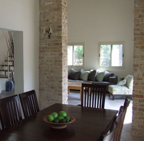 סלון ופינת אוכל עם קיר לבנים חוצץ