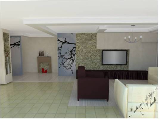 עיצוב פנים - חיפוי גבס בשילוב עם חיפוי אבן משמשת כתחליף עיצובי למזנון הפלזמה, תקרה דקורטיבית בשילוב תאורה גלויה וסמויה, קמין דקורטיבי, נישה גבס בשילוב אבן עם אגרטל