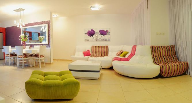 סלון מודולרי משולב עור ובד פסים בדירה במרינה באשדוד. עיצוב חני פוקס