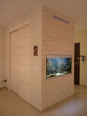 אזור מבואה מול פינת אוכל בשילוב אוקווריות שקוע, עיצוב סיגל נייגרציק אבירם