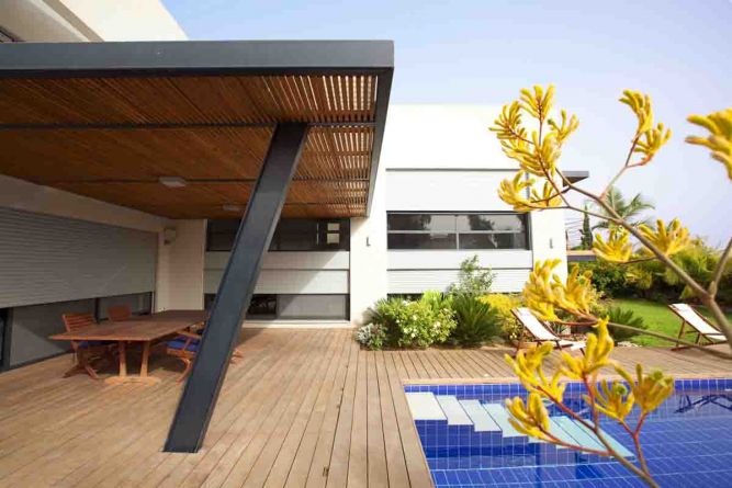 חזית אחורית לבית פרטי, כולל פרגולה, דק ובריכת שחיה בתכנון ועיצוב של איציק ניב