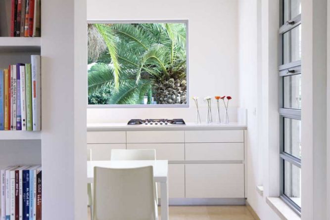 מבט שונה למטבח מעוצב בקווים נקיים על טהרת הצבע הלבן בתכנון ועיצוב של איציק ניב