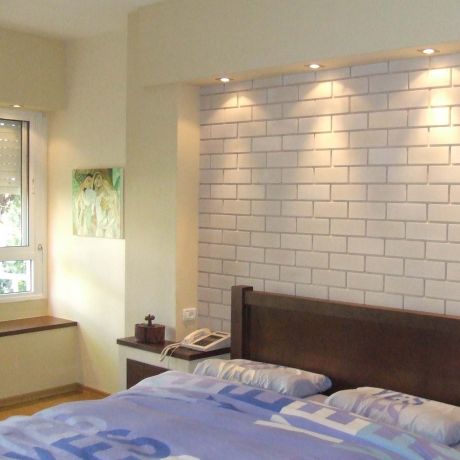 קיר בריקים לבן בגב המיטה, עיצוב ורד פולקמן