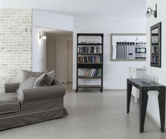 מבט אל חלל הסלון המעוצב ואל המזדרון בבית בקריית אונו בעיצוב ותכנון של הילה לוסקי