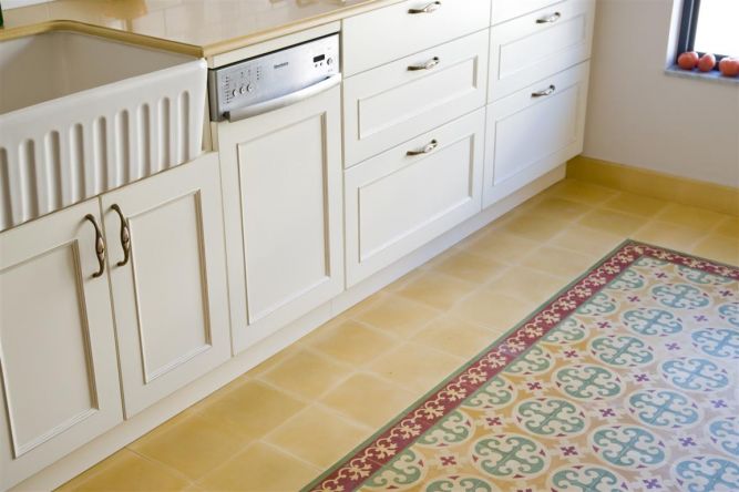 מבט מקרוב למטבח כפרי עם ריצוף מצויר - תכנון הילה לוסקי