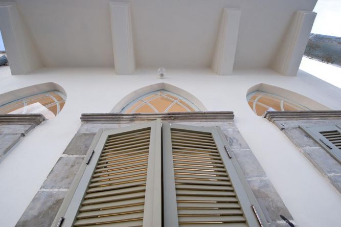 חזית בניין לשימור ביפו. התריסים והחלונות הותאמו מחדש לפתחים הקיימים. תכנון ועיצוב של הילה לוסקי