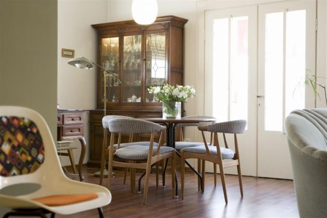 מגורים בת"א, בסגנון רטרו, מבט אל פינת האוכל - עיצוב ותכנון של הילה לוסקי