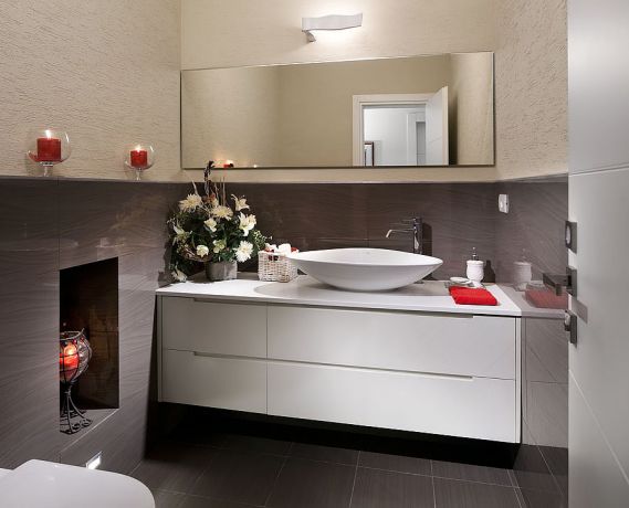 עיצוב חדר רחצה המשלב קרמיקה מודרנית, ארון מרחף וטייח גלי.עיצוב: יוסי שאול YS-DESIGN