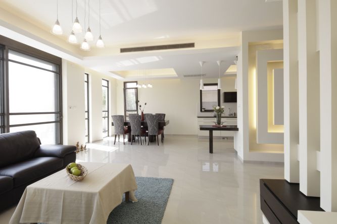 עיצוב סלון של בית פרטי בסגנון מודרני בשילוב נישות גבס. עיצוב: בשתי דיזיין סטודיו