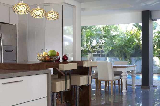מבט מהמטבח לעבר פינת האוכל והמרפסת, המעוצבים כולם בסגנון מודרני. עיצוב פנים: יוסי שאול.YS-DESIGN