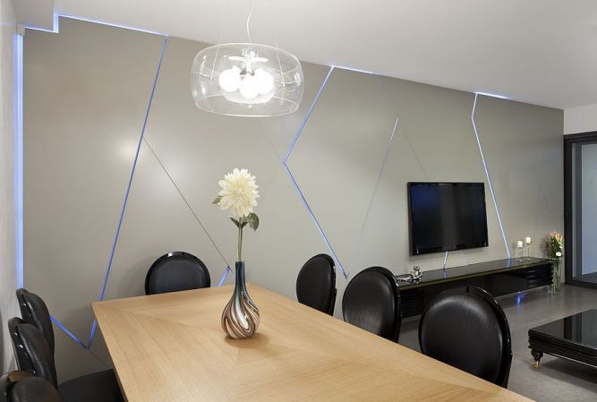 קיר סלון בגימור אפוקסי מיוחד ובשילוב תאורה סמויה. עיצוב: יוסי שאול YS-DESIGN