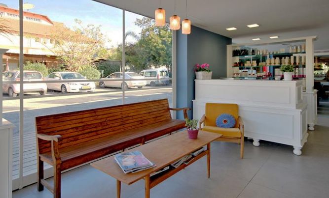 עיצוב מספרה במבט על אזור ההמתנה והקבלה - בעיצוב ותכנון של סטודיו קרן רוזנר