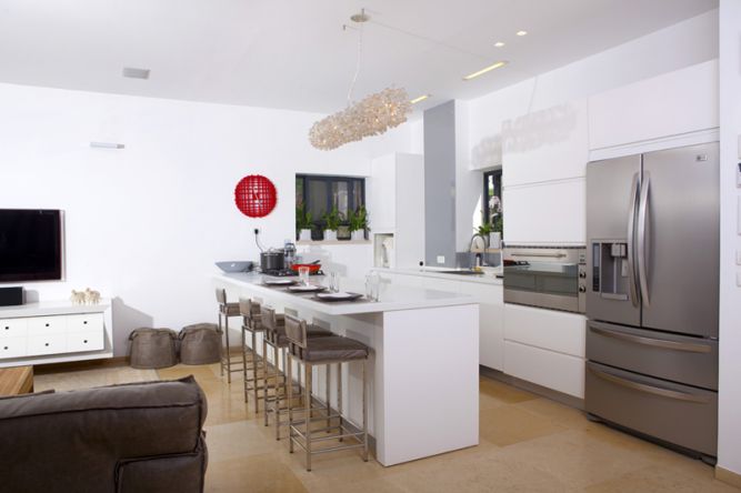 מטבח פתוח הנושק לסלון, מעוצבים בקווים מודרניים של סיגל לנמן סוקול אדריכלות ועיצוב פנים