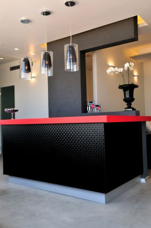דלפק הכניסה במכון יופי בנמל ת''א, שילוב של אדום ושחור בסגנון מודרני. עיצוב: חיה ברק - סטודיו Hb