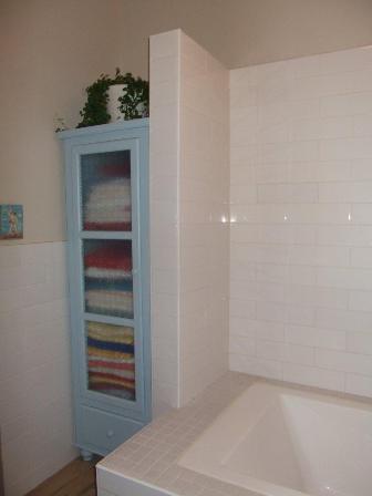 ארון אחסון למגבות שנותן נקודה של צבע. חדר אמבטיה בעיצוב חיה ברק