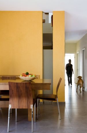 פינת אוכל בצבעים חמים ומבט אל המסדרון. עיצוב של saab architects