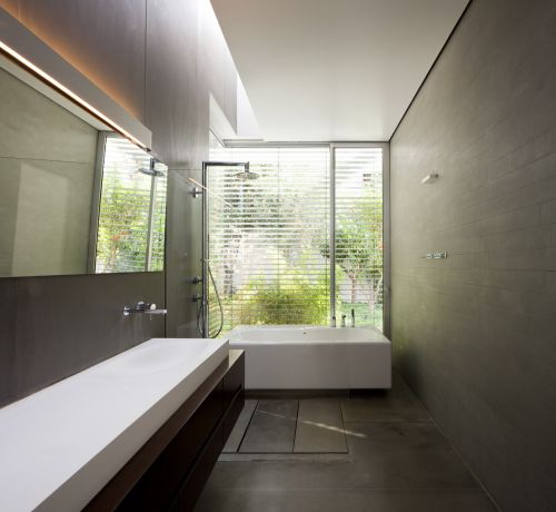 אבן בחיתוכים שונים באמבטיה. עיצוב: אדריכל מרק טופילסקי