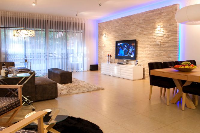 סלון בסגנון מודרני המשלב קיר בריקים לטלוויזיה ומשחקי תאורה בעיצוב ענבל ברקוביץ'