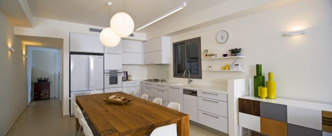מטבח לבן בשילוב שולחן עץ מלא ושידה צבעונית. עיצוב: לילך לויט