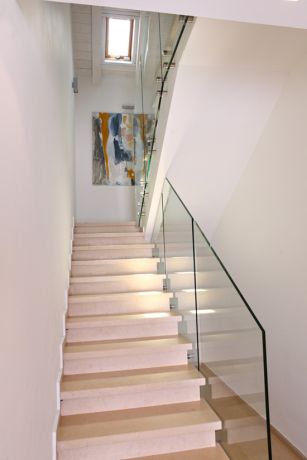 מדרגות עם מעקה זכוכית נקי ללא ידית. עיצוב: סיגל לנמן סוקול