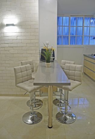 פינת אוכל בסגנון מודרני המורכבת משולחן בר וכסאות גבוהים. עיצוב: i.m design