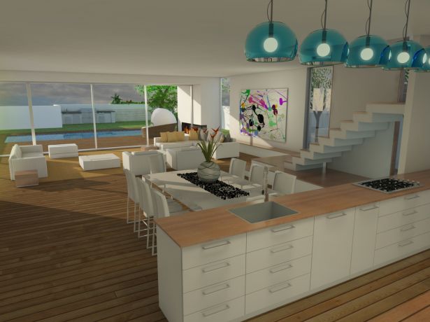 הדמייה של מטבח, סלון ופינת אוכל. עיצוב: בראון חלפין אדריכלים