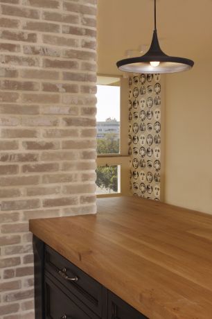 מבט מהמטבח אל קיר הבריקים הצמוד לו, בדירה למכירה בת"א. עיצוב: טלי סטוף
