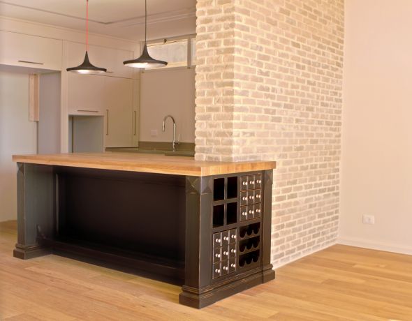 מבט אל המטבח המעוצב בקו כפרי וחם ונושק לקיר בריקים, בדירה למכירה בתל אביב. עיצוב: טלי סטוף