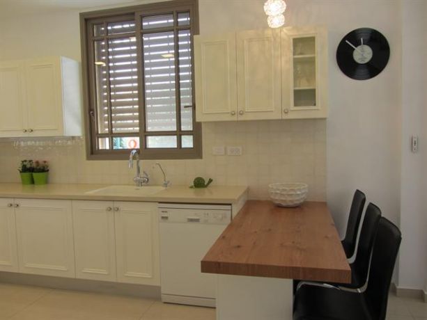 מטבח צעיר וקליל בגוונים בהירים בשילוב של עץ בוצ'ר, בעיצוב מגי דוידוב