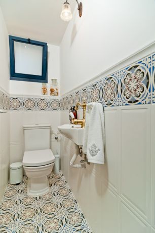 שירותי אורחים בשילוב קרמיקה בדוגמת רטרו צבעונית. עיצוב: מעשה בבית