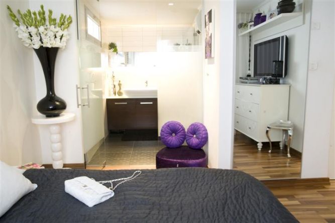 מבט דרך חדר השינה אל חדר המגורים והאמבטיה בעיצוב מרשים ויוקרתי עם הקפדה על פרטי הריהוט של ג'ני דיין הום סטיילינג