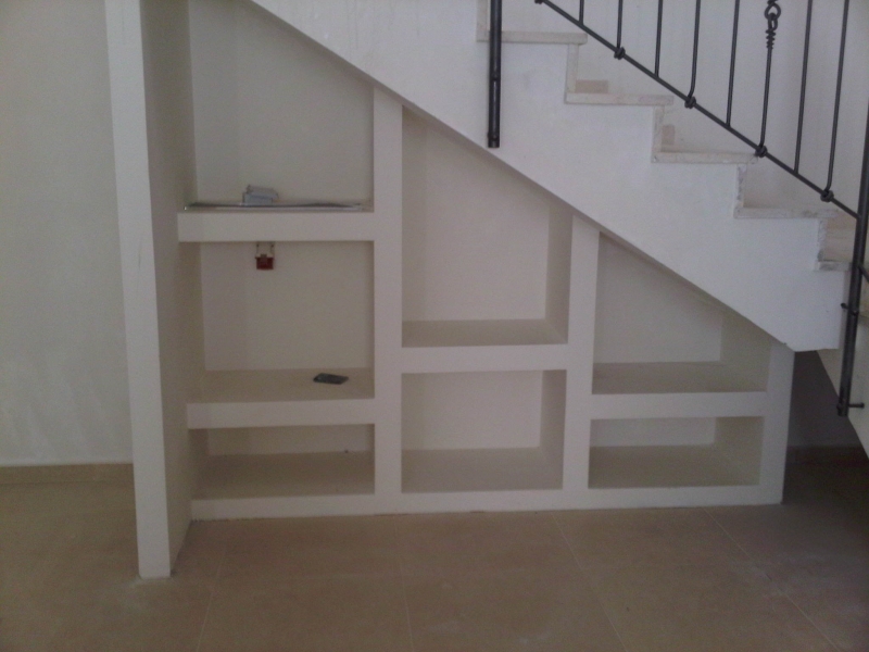 נישת גבס מתחת למדרגות לאחסון וחסכון במקום עבודת אומנות הצבע והגבס