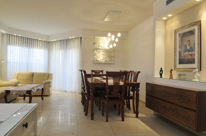 מבט על פינת האוכל והסלון בדירה המעוצבת בסגנון קלאסי ויוקרתי, מיכל חורש סומך אדריכלית