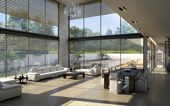 מבט פנים על סלון עם חלל כפול, תכנון - טי.אל.וי סטודיו