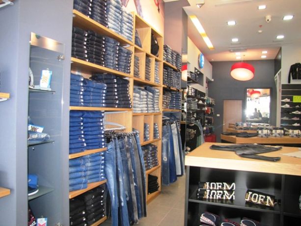 קיר בחנות בגדים המשולב מדפים מודולרים וקבועים. שלומית בן-צור תכנון ועיצוב פנים