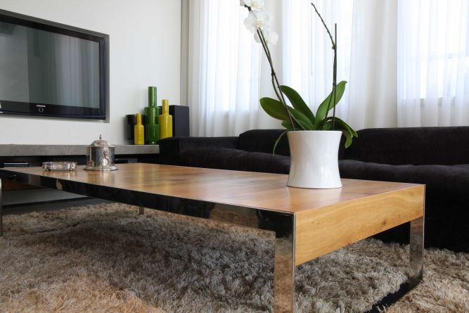 עיצוב מודרני לחדר מגורים, הכולל שולחן קפה, ספה, פלזמה ושטיח. יניב סולומון - אדריכלות ועיצוב פנים