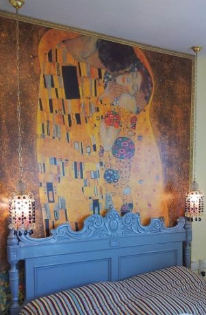 חדר שינה עם מיטה עתיקה, טפט תמונה ותאורת אווירה. עיצוב מרעננן וחדשני ע''י MikMik Design - מיקה אלטר.