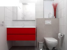 עיצוב ייחודי ומרשים למקלחת ילדים, גווני לבן בשילוב אדום בוהק. חגית רוזנברג, תכנון ועיצוב פנים
