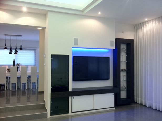 קיר גבס מעוצב עם תאורה נסתרת בשילוב עם נגרות ומקומות אחסון