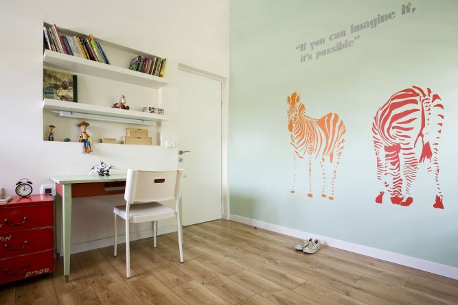 חדר ילדים, מדבקה, קיר ירוק ושולחן כתיבה. עיצוב אורלי אביטל