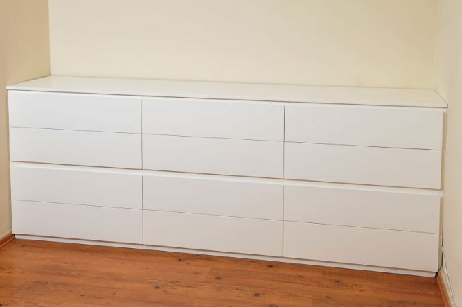 חדר שינה, שילוב ריהוט נקי -שלייף לק לבן עם עם מיטה מעץ אלון