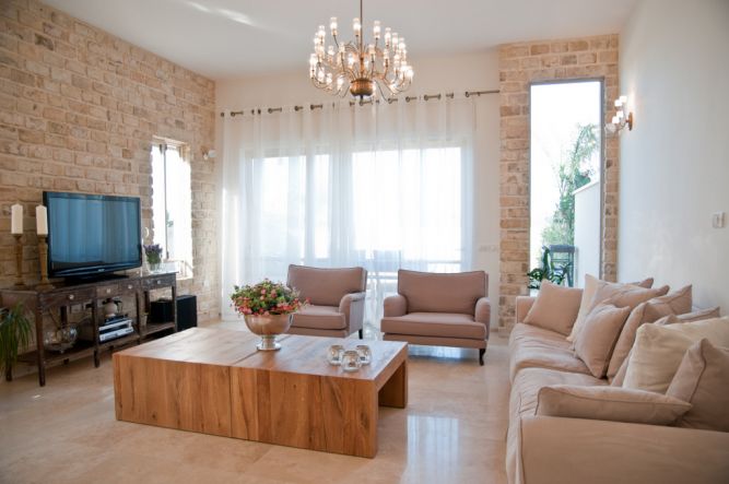 מבט אל סלון מעוצב בסגנון פרובאנס בשילוב בריקים - עיצוב ליהי שמאי