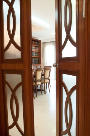 הצצה לחדר סלון בבית חרדי, הכולל עיצוב דלתות הכניסה