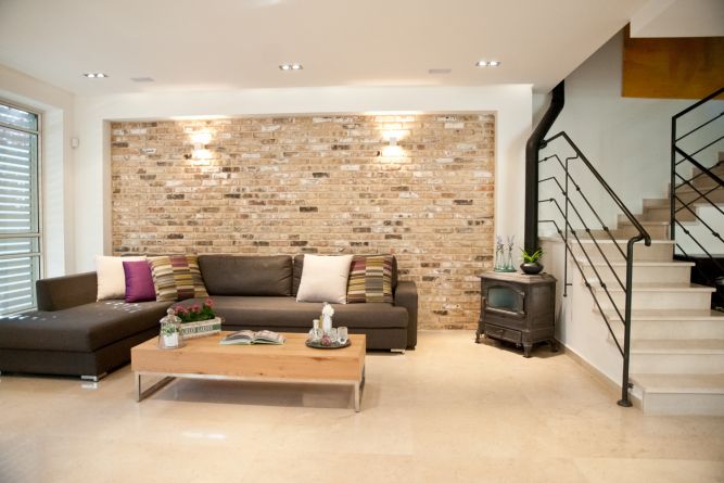 מבט אל סלון בקווים נקיים בשילוב בריקים - בעיצוב ליהי שמאי